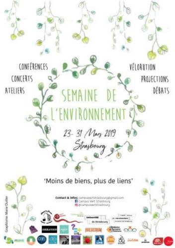 Cette année encore l’association étudiante Campus Vert Strasbourg organise la Semaine de l’Environnement, un événement national qui vise à sensibiliser chacun à l’environnement et l’écologie. Ce festival permet de s’interroger ensemble autour des problématiques écologiques et vise surtout à donner des solutions possibles, dans lesquelles chacun peut s’investir à sa manière. La Semaine de l’Environnement, c’est aussi un moment convivial et de partage à vivre entre amis ou en famille pour découvrir une multitude de thématiques et d’ateliers ! Des associations de toute la ville seront présentes pour présenter les actions qu’elles font au quotidien pour changer les choses comme Bretz’selle, l’Aire du temps, la Recyclerie by Amitel, Altern &Go, Unis-cité, la LPO, les Composteurs de Strasbourg et bien d’autres !