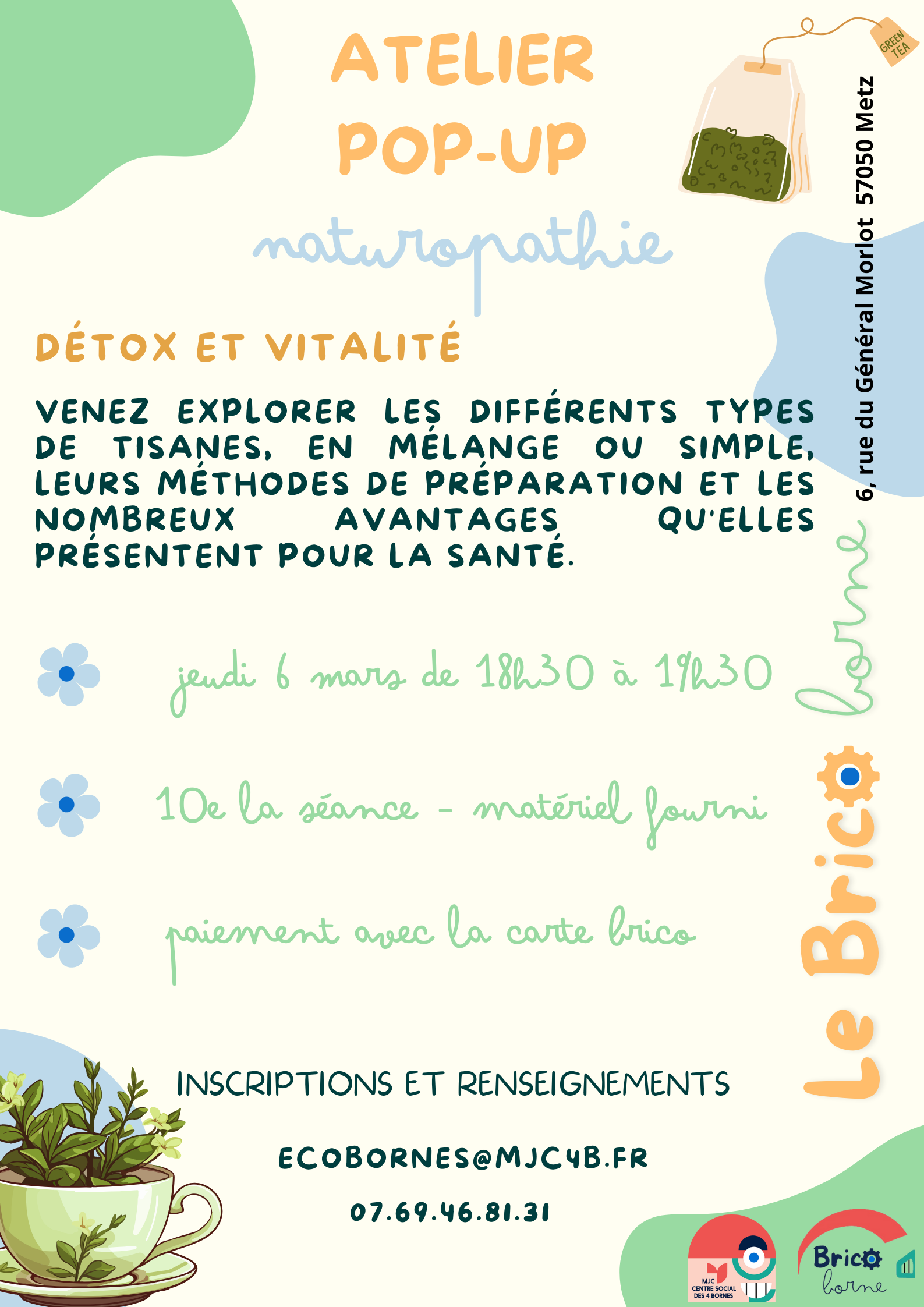 Pour ce nouvel atelier de Naturopathie prévu le ?e?d? ? ?a?s, Ophélie abordera avec vous les bienfaits des tisanes.