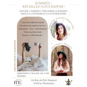 Nous vous invitons à cet atelier, animé par Manon Burstert - Naturopathe et Stéphanie Fink - Praticienne en hypnose et PNL  pour découvrir les solutions naturelles afin d'améliorer la qualité de votre sommeil et sortir des bras de Morphée le lendemain matin sans difficultés.