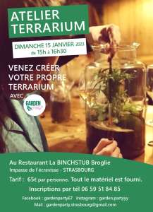 Venez créer votre terrarium tropical avec GARDEN PARTY lors d'un atelier convivial au restaurant La Binchstub Broglie, impasse de l'écrevisse à Strasbourg.