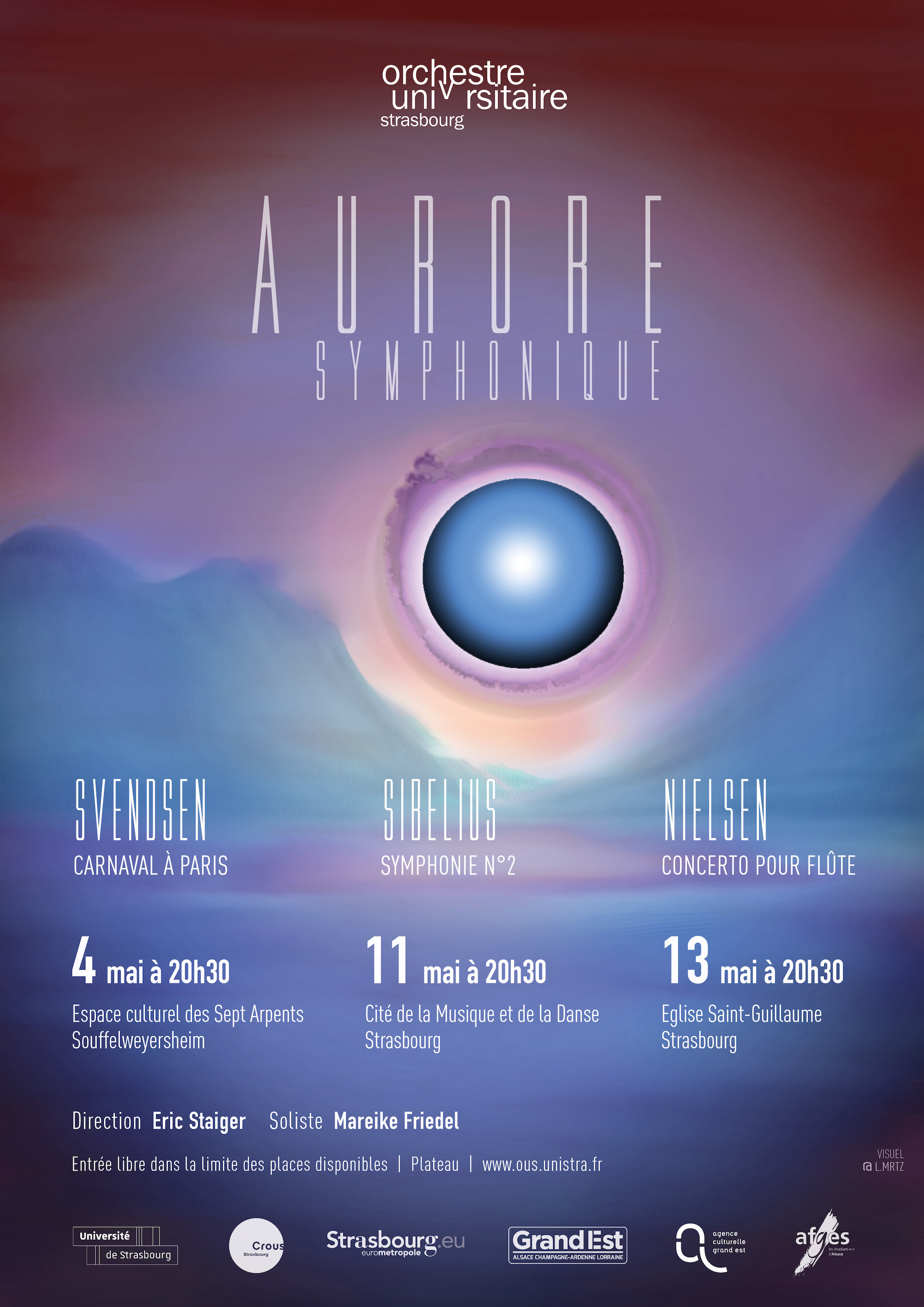 L'Orchestre Universitaire de Strasbourg vous propose un programme aux accents scandinaves intitulé : Aurore Symphonique. L'orchestre et ses 80 musiciens sont placés sous la direction d'Eric Staiger, chef invité pour ce semestre.