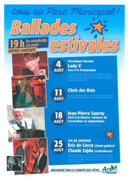 Le Comité des fêtes d’Ars-sur-Moselle, près de Metz, vous invite à écouter les ballades estivales tous les vendredis au parc municipal.