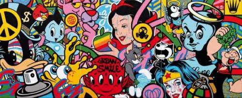 L’oeuvre de Speedy Graphito est ponctuée de références plus ou moins cachées. Personnages de cartoon, logos, citations picturales dialoguent, se répondent et s’entrecroisent pour nous donner à voir la société dans laquelle nous sommes immergés sans plus trop nous en rendre compte.