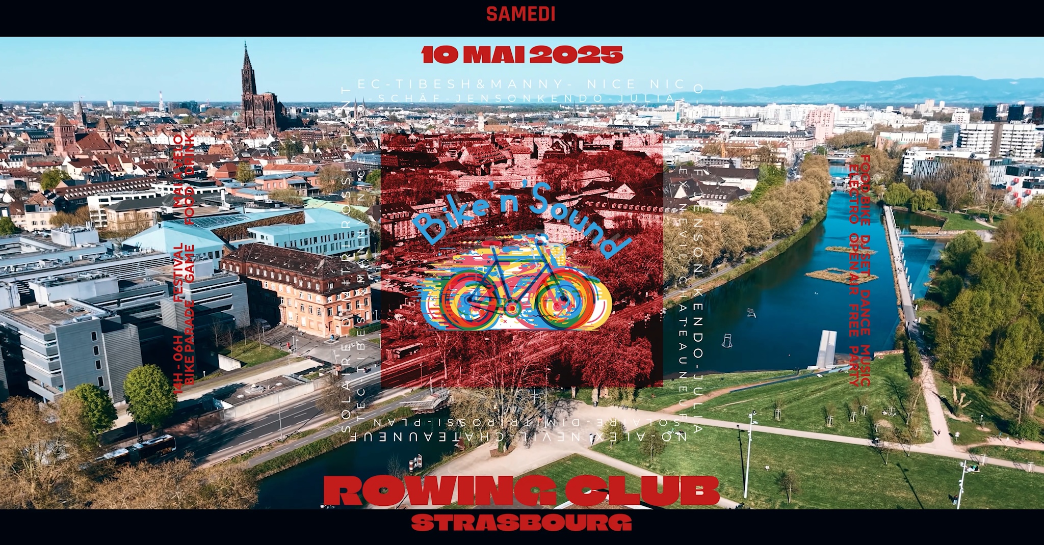 **Bike’n’Sound débarque au Rowing Club Strasbourg (Parc du Heyritz) pour “Mai à Vélo”** avec une **parade à vélo déjantée**, un **village en plein air**, et une **soirée indoor dans la salle du Rowing Club Strasbourg** transformée pour l’occasion en véritable club avec **vestiaires, lumières, déco et gros son**. ??