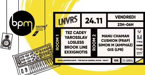 Après une édition 2016 très suivie, et dont l’étape nancéenne a laissé un gros souvenir, le BPM reprend sa tournée 2017 et pose ses fly cases le 24 novembre à LNVRS Club. Pour l’occasion, les révélations BPM seront accompagnées de Tez Cadey, figure montante de la scène électro-pop française, de Manu Chaman, fondateur de l’écurie Carte Blanche et de nombreux crews de la scène électronique nancéienne.