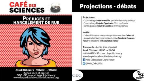 Le jeudi 03 mars, l’association Les Petits Débrouillards du Grand Nancy et l’association du GEC organisent un Café des Sciences sur le thème ’Préjugés et harcèlement de rue’.