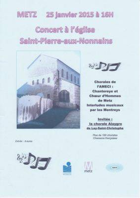 L’Association Messine d’Ensemble Choraux et Instrumentaux (AMECI), soutenue par la ville de Metz et le Conseil Général de Moselle, regroupe trois de ses formations et invite une chorale amie pour organiser un concert de chant choral dans l’écrin de St Pierre-aux-Nonnains. Le programme présente de la variété essentiellement française, mais aussi étrangère.