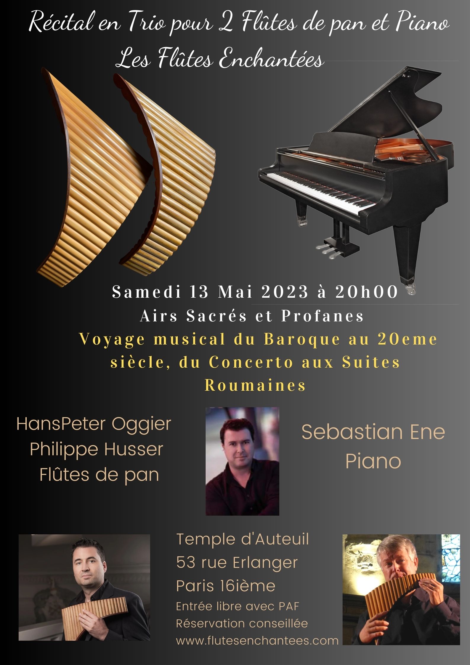 Samedi 13 mai 2023, à 20h00, "les flûtes enchantées" vous propose un concert pour 2 flûtes de pan et piano, au temple d'auteuil, 53 rue Erlanger 75016 Paris.
