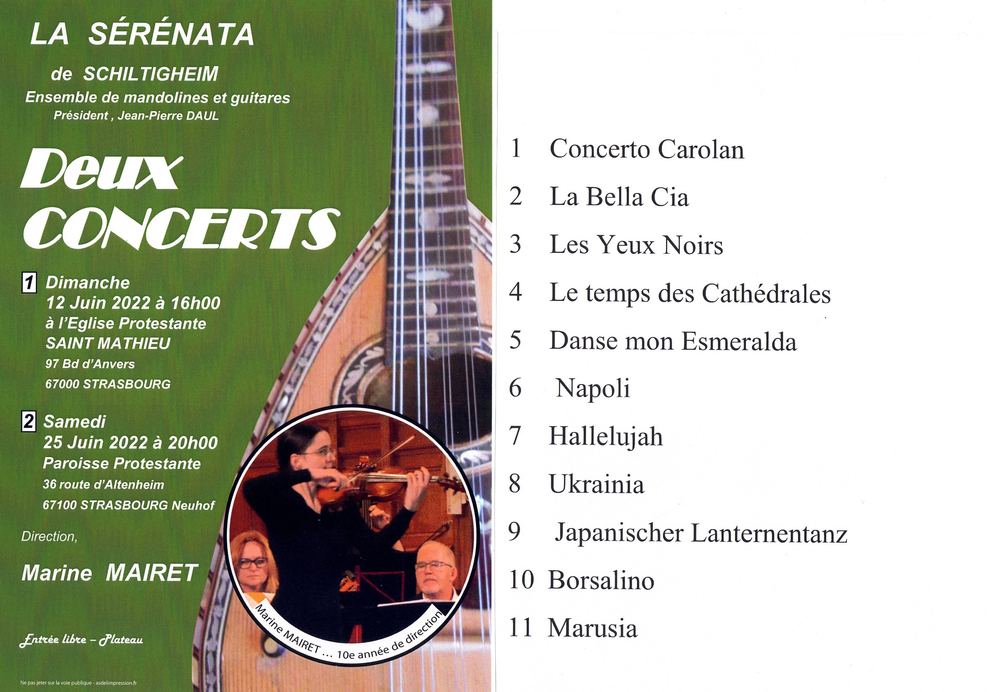 La Sérénata de Schiltigheim est un Orchestre à Plectre (OAP) qui  interprète des pièces baroque, classiques, modernes, populaire et traditionnelles La Bella Chiao, Les yeux noirs, Hallelujah , ou écrites pour les films comme Borsalino, Le temps des cathédrales ou Danse mon Esméralda. Pour cette Fête de la mandoline, le programme se composera d’extraits d'un répertoire varié où figurent : Carolan, E. Mezzacapo, R. Cocciante, Yoshitomo, Rudolf Krebs, Calace, L. Cohen, et Sylvain Dagosto qui a composé et arrangé spécialement pour la mandoline et les OAP beaucoup de pièces comme Ukrainia et Marusia.