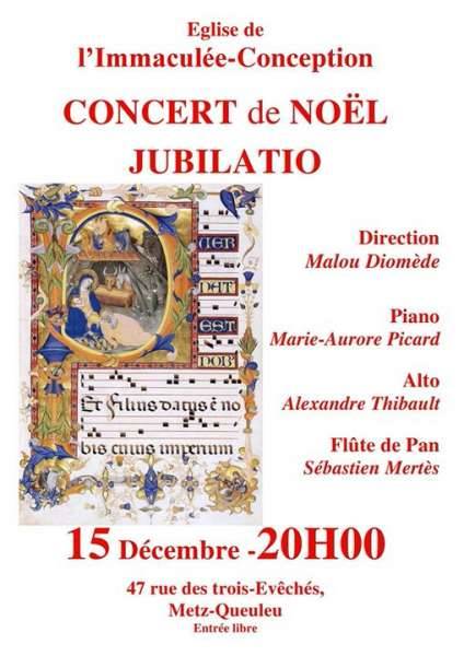 Comme chaque année depuis sa création en 1995 où la petite chorale paroissiale de Saint Martin-aux-Champs donnait son premier concert de Noël avec une poignée de paroissiens, Jubilatio a depuis, grandi, pris de l’ampleur. C’est ainsi, qu’avec ses quelques quarante choristes ou plus, cette chorale à la fois liturgique et concertante proposera à l’église de l’Immaculée Conception de Metz, un répertoire festif de circonstance, pour bien vivre le temps de l’Avent et fêter la joie de Noël. Cette année, les anges seront bien dans les campagnes, Minuit Chrétiens ou Joy to the world sonneront au loin et les santons ou le petit garçon seront de la fête et viendront étoffer le répertoire classique ancien ou nouveau pour faire revivre nos beaux souvenirs et noëls d’antan. Au piano, Marie-Aurore Picard, à l’alto Alexandre Thibault et à la flûte de pan, Sébastien Mertès. Un beau moment à partager.
