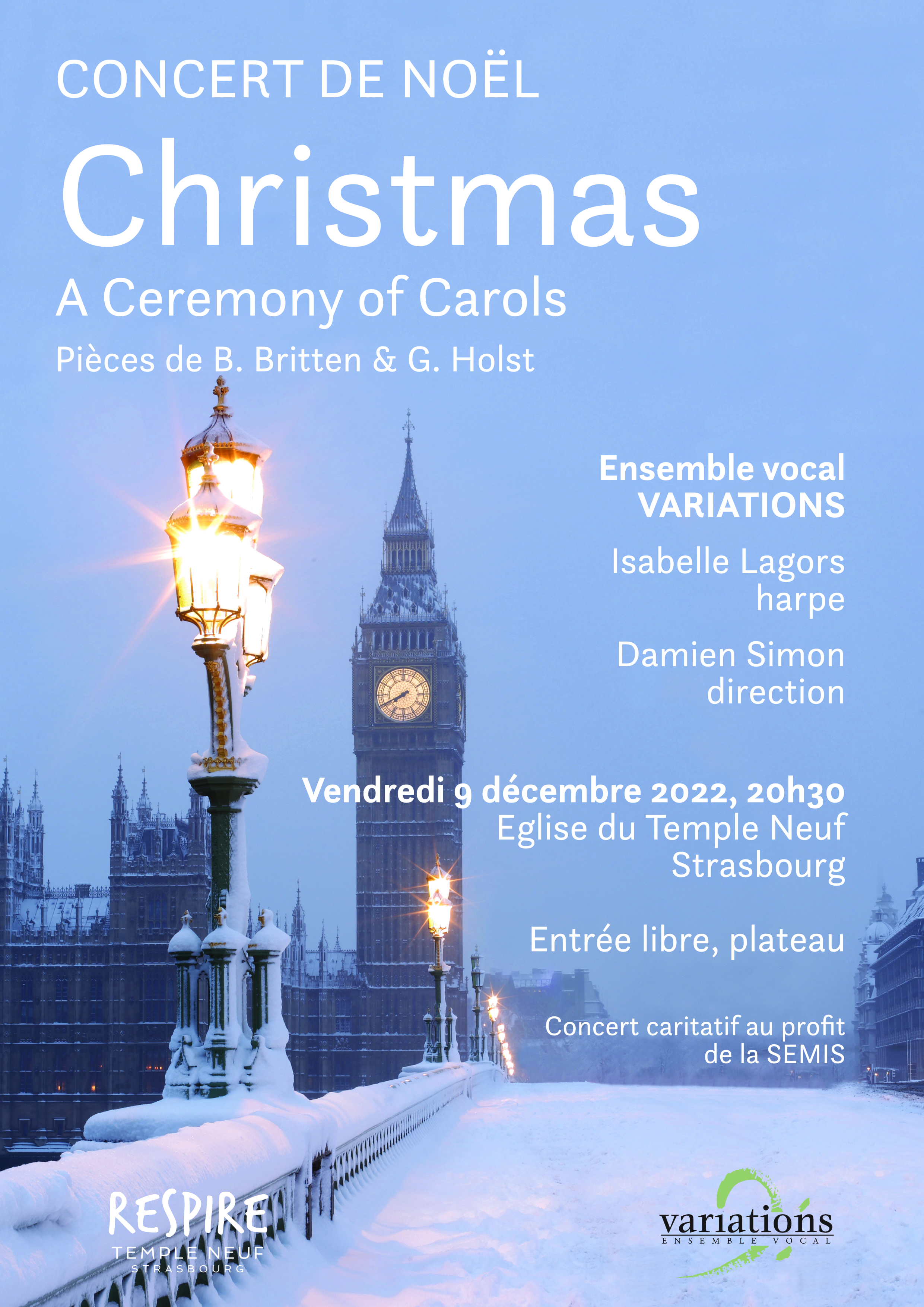 C’est à un Noël d’outre-Manche que nous vous convions avec au centre de ce programme les célèbres Ceremony of Carols de Benjamin Britten mais aussi l’impressionnant Ave Maria de Gustav Holst pour double-choeur féminin (8 voix).