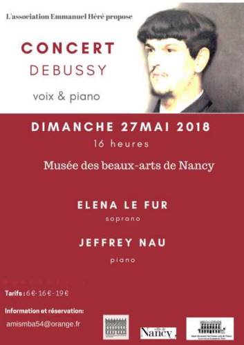 Concert Debussy avec le pianiste Jeffrey Nau et la Soprano Elena Le Fur organisé par l’Association Emmanuel Héré des Amis du Musée des Beaux-Arts de Nancy, le Dimanche 27 mai 2018 à 16h à l’Auditorium du Musée des Beaux-Arts de Nancy.