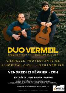 Le vendredi 21 février à 20h, le duo Vermeil, composé des guitaristes Evan Vercoutre et Guilhem Maynier, se produira pour un concert à la Chapelle Protestante de l’Hôpital Civil de Strasbourg. Les deux musiciens se rencontrent lors de leurs études à la Haute Ecole des Arts du Rhin de Strasbourg. Après plusieurs collaborations artistiques et pédagogiques, ils forment le Duo Vermeil en 2022.