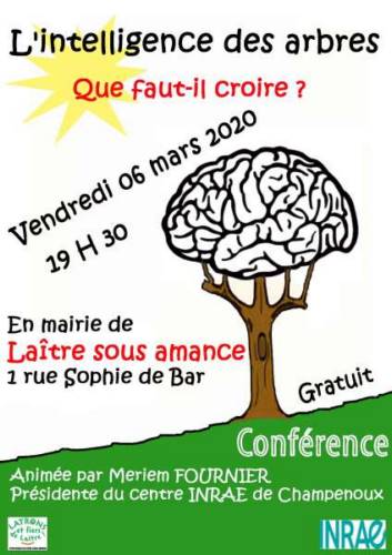 Le vendredi 06 mars à 19h30 aura lieu une conférence suivi d’un débat, animée par Meriem Fournier, présidente de l’INRAE (ex-INRA) de Nancy- Champenoux, sur le thème : l’intelligence des arbres, que faut il croire - Un sujet qui fait suite au bestseller écrit par Peter Wohlleben "La Vie Secrète des Arbres", écoulé à plus de 250000 exemplaires en France, et au film qui a suivi, "l’intelligence des arbres", sorti en 2017. Les arbres communiquent ils entre eux - Le sujet, qui fait débat, sera examiné sous le regard des scientifiques, essayant de démêler la part de rêve et de réalité. Lieu : mairie de Laitre sous Amance, 1 rue Sophie de Bar, 54770 Laitre sous Amance. Entrée libre.