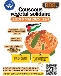 Repas solidaire le 8 mai à Metz Borny, au bénéfice de l'association HuSoMe qui œuvre à Gaza pour restaurer l'eau potable et à ouvrir des centres de soins primaires.