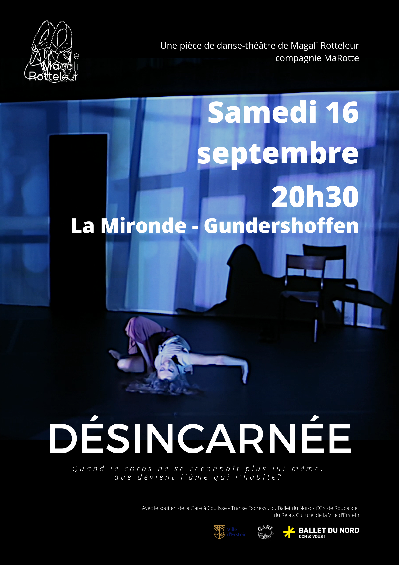 « Mon corps ne peut plus se « voir » lui-même s’il a perdu ses yeux, n’est-ce pas ? Aussi je dois l’observer – être ses yeux, n’est-ce pas ? » Quand le corps ne se ressent plus lui-même, que devient l’âme qui l’habite ? Dans un spectacle mêlant danse-théâtre et projection vidéo, librement inspiré du récit d’Oliver Sacks La Femme désincarnée, la danseuse raconte l’épopée d’une femme ordinaire et extraordinaire qui a perdu le contact avec son corps.