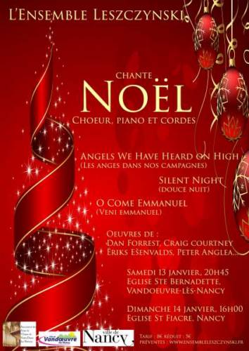 Afin de commencer l’année en musique, et pour prolonger encore un peu l’esprit de Noël, l’Ensemble Leszczynski propose deux concerts les samedi 13 janvier et dimanche 14 janvier 2018 prochains, à Vandœuvre-lès-Nancy et Nancy, pour découvrir notre programme de Noël pour chœur, piano et cordes.