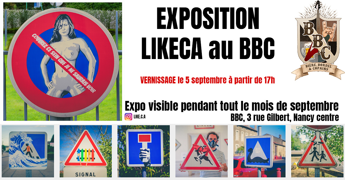 LIKECA, l'artiste street-artiste reconnu pour ses détournements humoristiques de panneaux de signalisation, vous invite à découvrir son exposition captivante au BBC tout au long du mois de septembre.