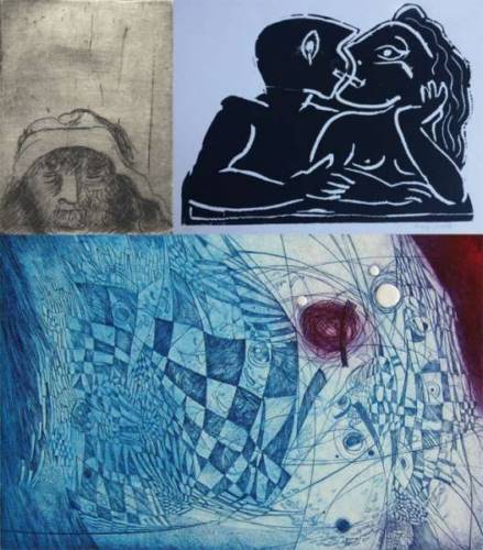 Elle a apporté pour cette exposition une série de gravures réalisées à l’aide de la technique dite « au sucre ». A l’aide d’un mélange au sucre appliqué sur la plaque d’impression, ce procédé permet une mise en oeuvre souple et intéressante de l’eau forte et de l’aquatinte. Elle a réalisé de cette façon quelques séries d’estampes en majorité non figuratives et en noir et blanc.