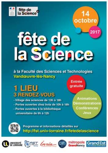 La Faculté des Sciences et Technologies organise un village des Sciences ouvert au grand public le 14 octobre de 13h à 18h à l’occasion de la fête de la Science 2017.