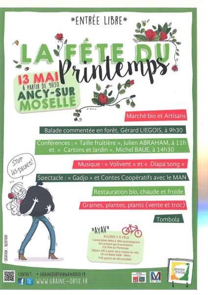 Marché bio, vente et troc de graines / plantes et plants, concerts et restauration bio !Le dimanche 13 mai, Ancy-Dornot fête le printemps. Pour la 13e édition, l’association Graine d’Ortie propose tout au long de la journée, à partir de 9h30, des activités autour du thème "STOP LES DECHETS".