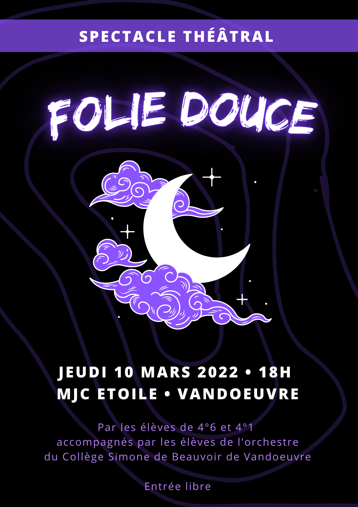 Dans le cadre du Festival "Les planches de l'Etoile" qui déroulera les 10 - 17 - 18 - 19 - 20 mars 2022, les élèves de 4°6 et 4°1 accompagnés par les élèves de l'orchestre du Collège Simone de Beauvoir de Vandœuvre présenteront leur pièce FOLIE DOUCE à 18h.