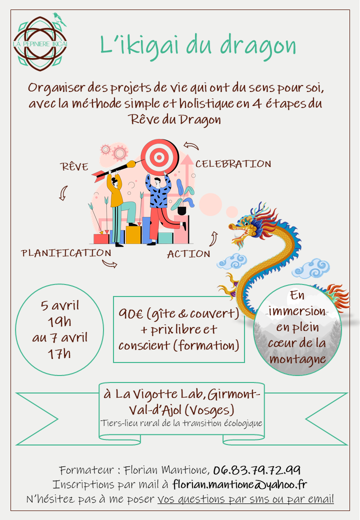 Si le cœur vous insuffle une envie d’actionner un changement, alors venez vous mettre en quête de votre ikigai en découvrant la méthode de gestion de projet holistique du Rêve du Dragon. L’immersion en gîte que propose la formation sera favorable à une qualité de présence intégrale, le tout dans un lieu ancré en plein Parc Naturel des Vosges, et ponctué de délicieux repas avec des produits frais et locaux ?.