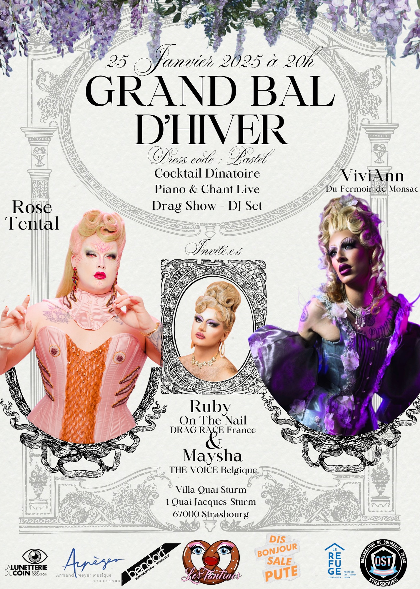Après une mise en bouche sur le doux son du piano live, vous pourrez assister à des drag shows d’exception présentés par Ruby On The Nail (Drag Race France 3), Rose Tental et ViviAnn Du Fermoir-de-Monsac, puis vous serez emporté.e.s par la douce voix de Maysha (The Voice Belgique), pour enfin faire virevolter vos crinolines jusqu'au beau milieu de la nuit sur un DJ set enflammé présenté par Ana Dolly et Shayan.