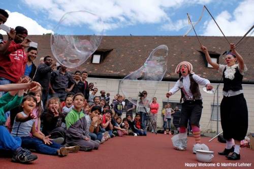 Ce film documentaire accompagne quatre clowns de l’initiative Clowns ohne Grenzen/Clowns sans frontière qui vont jouer dans des centres d’accueil de réfugiés. Leur spectacle veut être une aide pour les enfants dans leur nouvelle vie et un acte de bienvenue pour ces familles en détresse qui vivent la plupart du temps la froideur bureaucratique et les difficultés administratives. Le film montre la réalité quotidienne des réfugiés, les initiatives citoyennes pour leur accueil en Allemagne et évoque aussi les expériences qu’ils ont vécues au cours de leur tragique périple d’exilés.