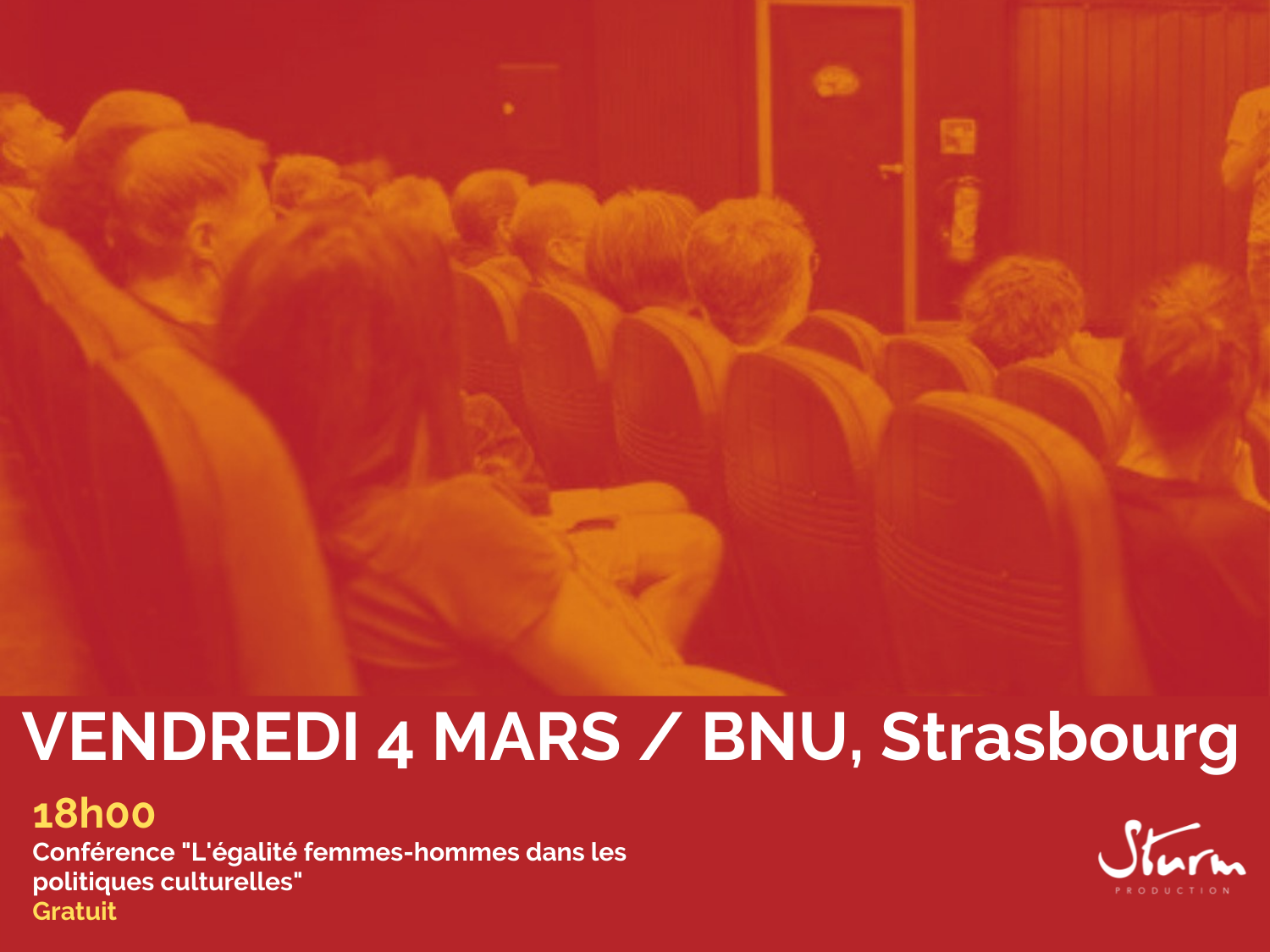 ➞ Gratuit (réservation conseillée) * Billetterie en ligne : https://www.helloasso.com/associations/sturm-production/evenements/l-egalite-femmes-hommes-dans-les-politiques-culturelles