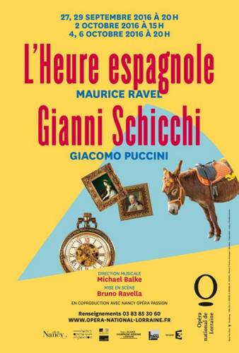 Notre saison lyrique 2016/2017 débute avec L’Heure espagnole de Maurice Ravel, et Gianni Schicchi de Giacomo Puccini, deux nouvelles coproductions de l’Opéra national de Lorraine et Nancy Opéra Passion que nous présenterons du 27 septembre au 6 octobre prochains.