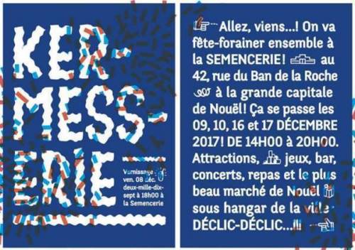 Allez, viens...! On va fête-forainer ensemble à la Semencerie ! Au 42, rue du Ban de la Roche à la grande capitale de Nouël ! Ça se passe les 9, 10 et 16, 17 décembre 2017 ! De 14h00 à 20h00. Attractions, jeux, bar, concerts, repas et le plus beau marché de Nouël sous hangar de la ville : déclic-déclic...!!!