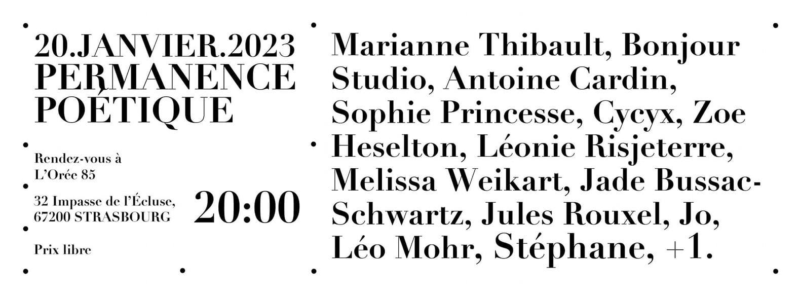Vous êtes invité.es à la cinquième session publique de la PERMANENCE POÉTIQUE : une soirée de lectures et de performances artistiques.