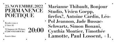 Vous êtes invité.es à la quatrième session publique de la PERMANENCE POÉTIQUE : une soirée de lectures et de performances artistiques.