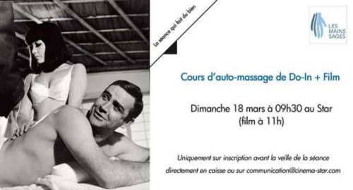 Afin que votre rencontre avec les oeuvres projetées aux cinémas Star se déroule au mieux, ’Les mains sages’ vous proposent de venir au cinéma et de préparer au mieux votre séance. Dans une salle calme et lumineuse, découvrez en première partie de votre séance de cinéma un cours d’automassage : le Do-in. Cette technique d’auto-massage qui associe pressions, frictions et tapotements des doigts sur l’ensemble du corps apaise, relaxe et revitalise.