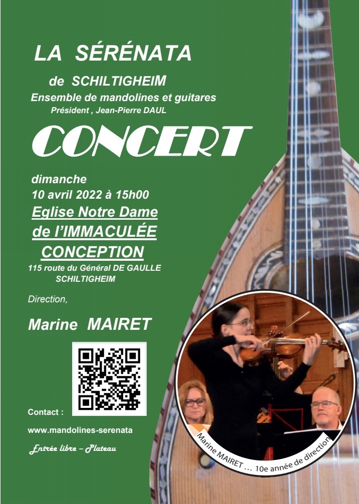 LA SERENATA de Schiltigheim est un orchestre de mandolines accompagnées par les mandoles, liuto cantabile, guitares et contrebasse, sous la baguette de Marine Mairet, cheffe dynamique qui est également violoniste soliste et enseignante de violon. Cet Orchestre à Plectre (OAP) interprète des pièces baroque, classiques, modernes, populaire et traditionnelles ou écrites pour les films comme Chi Mai, Borsalino, Le temps des cathédrales ou Danse mon Esméralda. Pour ce 92ème Anniversaire et lors de cette Fête de la mandoline, le programme se composera d’extraits d'un répertoire varié où figurent : Carolan, E. Mezzacapo, R. Cocciante, Yoshitomo, Rudolf Krebs, Calace, L. Cohen, et Sylvain Dagosto qui a composé et arrangé spécialement pour la mandoline et les OAP .