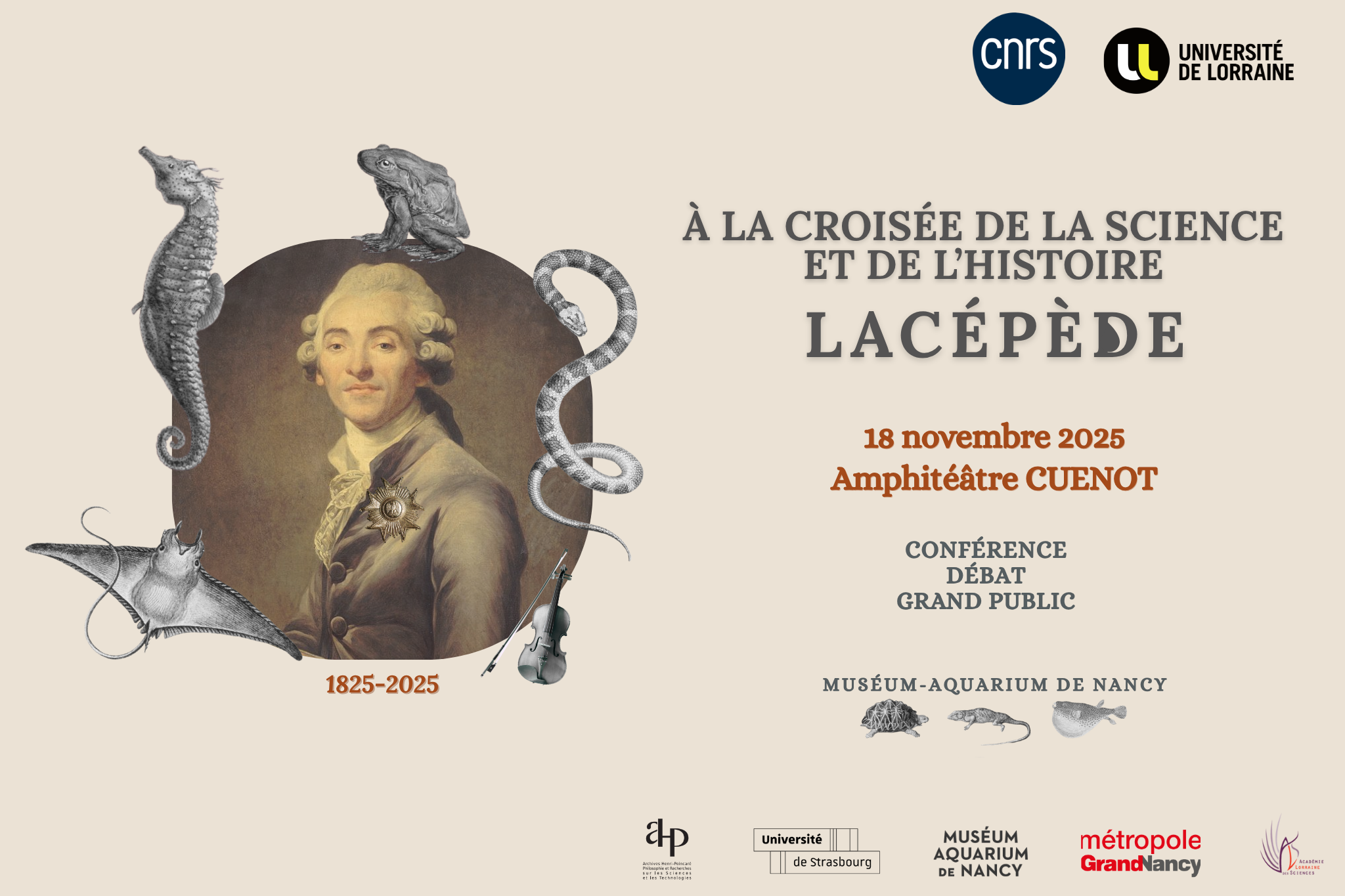 Venez découvrir la vie et l'œuvre de Bernard de Lacepède, un homme aux multiples talents : naturaliste, musicien et homme politique. Nous allons explorer son parcours et son époque à travers plusieurs sessions de conférences et de débats. Des spécialistes viendront partager leurs connaissances sur l'histoire naturelle, la classification des espèces et l'évolution, ainsi que sur l'acclimatation et l'aquaculture. Il y aura une pause déjeuner, et la journée se terminera par une discussion ouverte.