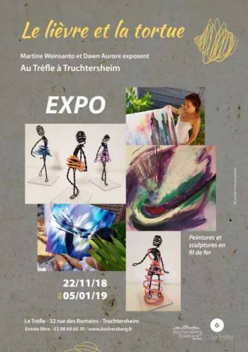 Martine Weinsanto et Dawn Aurore exposent au Trèfle à Truchtersheim jusqu’au 5 janvier 2019. Une exposition de peintures et de sculptures en fil de fer. Deux artistes différentes. Une jeune, une moins jeune. Une professionnelle, une amateure passionnée. D’où le lièvre et la tortue.