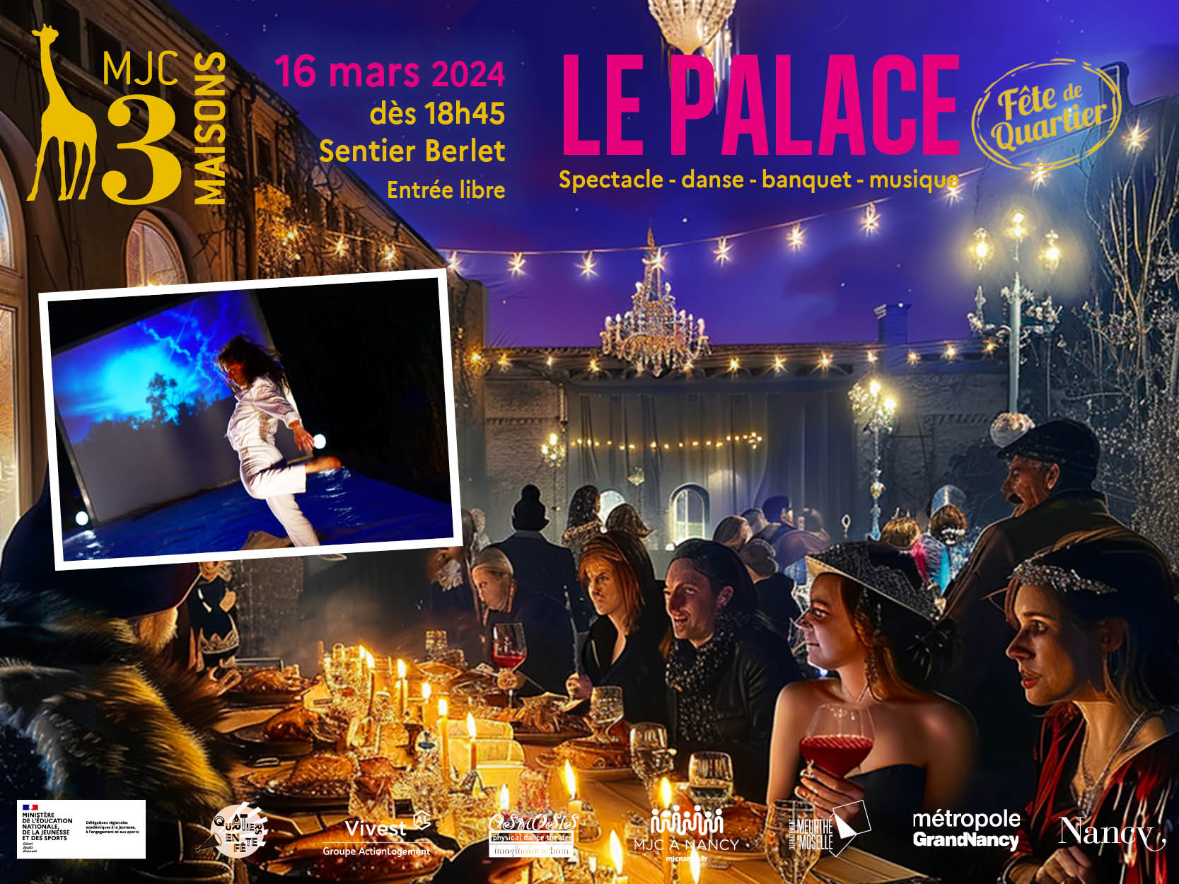 Après ce spectacle, déambulation du public et des artistes jusqu’au Palace, pour une arrivée vers 20h. Installé en extérieur dans la cour de l’ancienne école de la MJC, le banquet est illuminé par les différentes créations des ateliers participatifs et prend la forme d’une auberge espagnole. La cour de la MJC accueille une performance artistique de la compagnie grenobloise Histoire 100 fins, avec un spectacle de jonglerie pyrotechnique et LED.
