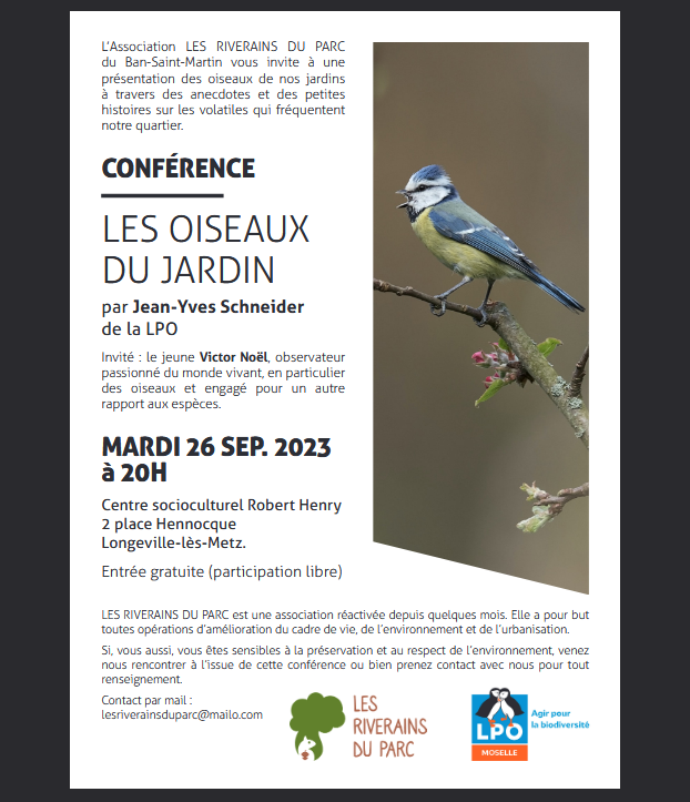 L'association LES RIVERAINS DU PARC du Ban Saint Martin vous invite à une présentation des oiseaux de nos jardins à travers d'anecdotes et d'histoires sur les volatiles qui fréquentent nos jardins.