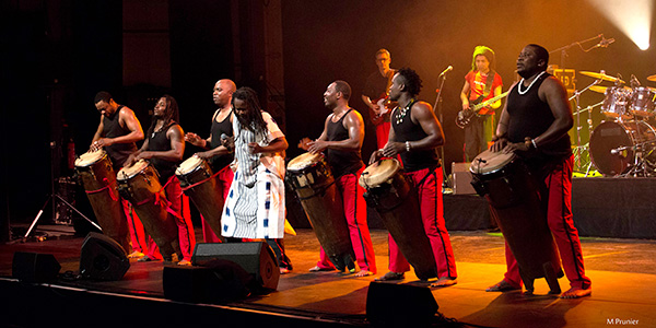 Un puis deux, et mille motifs ancestraux se déploient avec l’ampleur du son d’une grande scène. La voix des hommes répond au Ngoma, tambour traditionnel congolais, volant à leur ceinture. Ils se défient, miment des joutes pacifiques. Les voix des Tambours de Brazza s’expriment en Kongo, langue d’Afrique centrale aux soixante dialectes, et évoquent la guerre civile qui ravage le département congolais du Pool, la nostalgie du pays, mais aussi le courage de la fête : quand la sueur remplace les pleurs. Gaité, espoir et ferveur circulent dans les refrains fédérateurs.