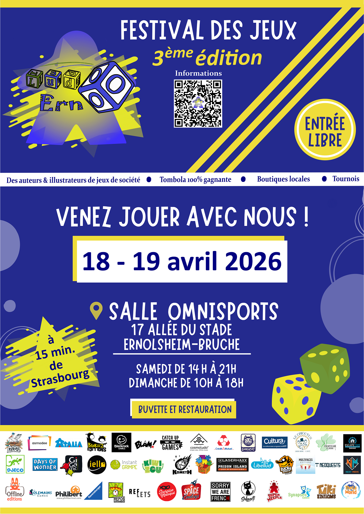L'association Ludimagine est heureuse de vous annoncer la troisième édition du festival des jeux Ludo'Erno qui aura lieu le 18 et 19 avril 2026 à la salle omnisports d'Ernolsheim-sur-Bruche.