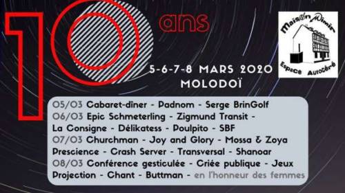 19h-22h boeuf-bouffe : ramène tes instruments pour partager un boeuf musical. A partir de récup’ alimentaire, le Molodoi sera ouvert l’après midi pour quiconque voudrait aider à la préparation du repas.