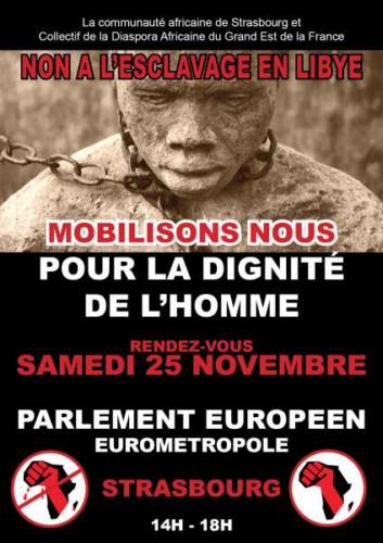 Dans le cadre de l’élan suscité par la vague d’indignations par rapport à la traite des noirs (migrants subsahariens) en Libye; le Collectif de la Diaspora Africaine de Strasbourg, se mobilise et organise ce samedi 25 novembre 2017 un rassemblement devant le parlement européen, afin de manifester son indignation face à ce commerce abject, indigne de l’humanité.