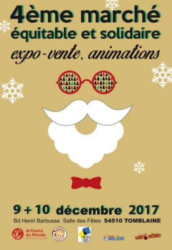 Le collectif de promotion du commerce équitable du Grand Est, Artisans du monde Nancy et Vêt Ethic organisent leur 4ème marché équitable et solidaire à TOMBLAINE (salle des fêtes Bd barbusse) le samedi 9 et dimanche 10 décembre.