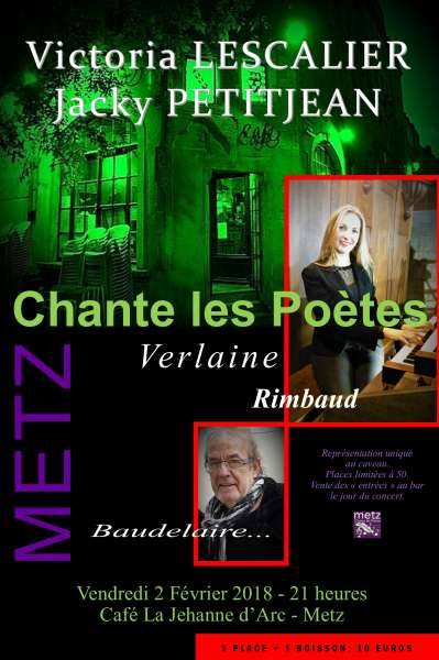 Venez découvrir Victoria LESCALIER au clavier et écouter Jacky PETITJEAN vendredi 2 février 2018 à 21h au caveau du café La Jehanne d’Arc à Metz. Amoureux de la poésie, ils vous interpréteront du Baudelaire, Rimbaud, Verlaine et bien d’autres comme vous ne les avez jamais entendu. Le prix des places est à 10 € avec une boisson comprise. Elles seront en vente à partir de 20h au bar du café le même jour que le concert. Places limitées à 50, aussi nous vous invitons à prendre vos dispositions. Merci et à bientôt parmi nous.