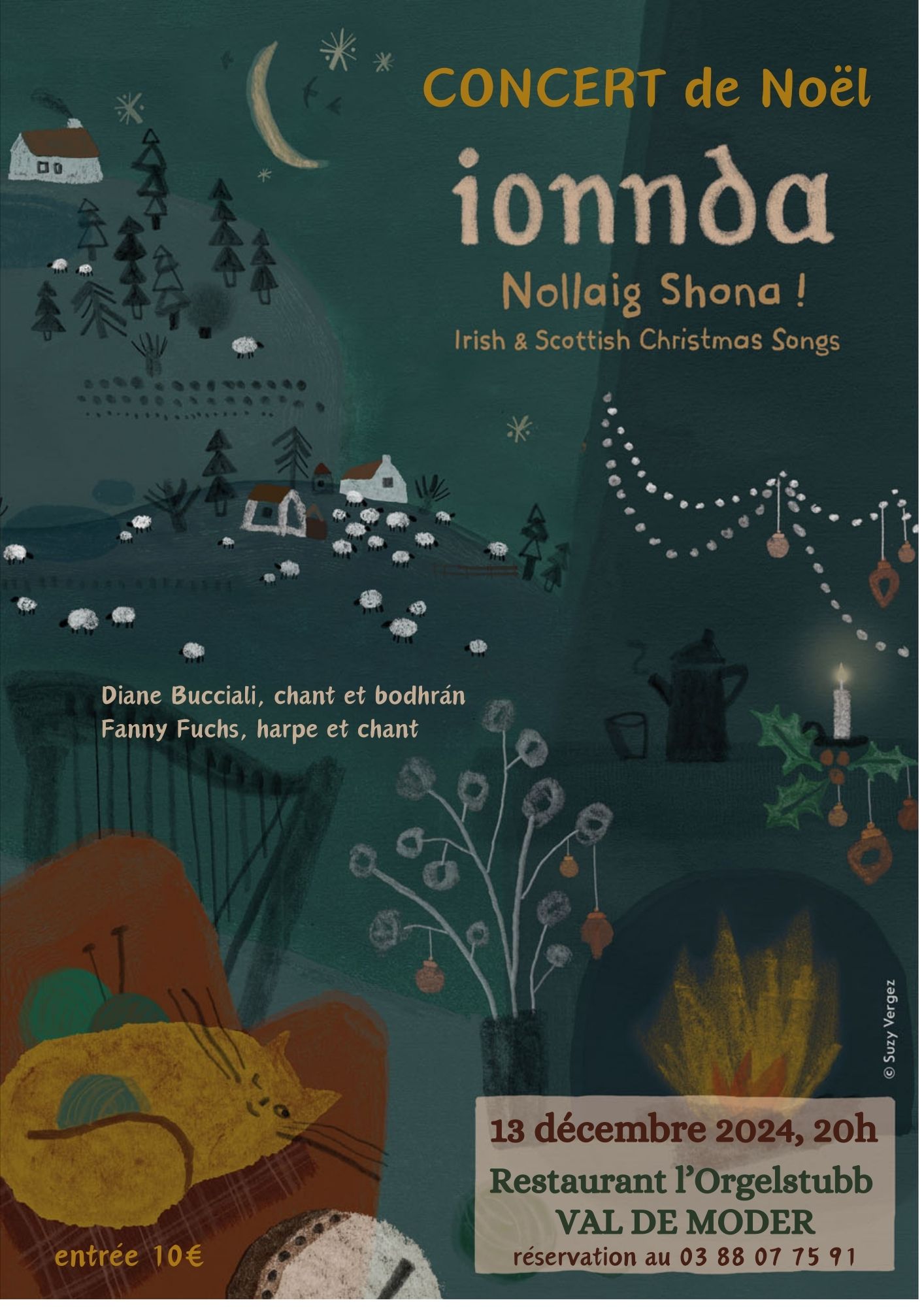 Le duo Ionnda réunit la chanteuse Diane Bucciali et la harpiste Fanny Fuchs. Par leurs voix et leurs instruments celtiques, les musiciennes apporteront au coin des cheminées alsaciennes les airs traditionnels de Noël venus d'Irlande, d'Ecosse et d'Angleterre.