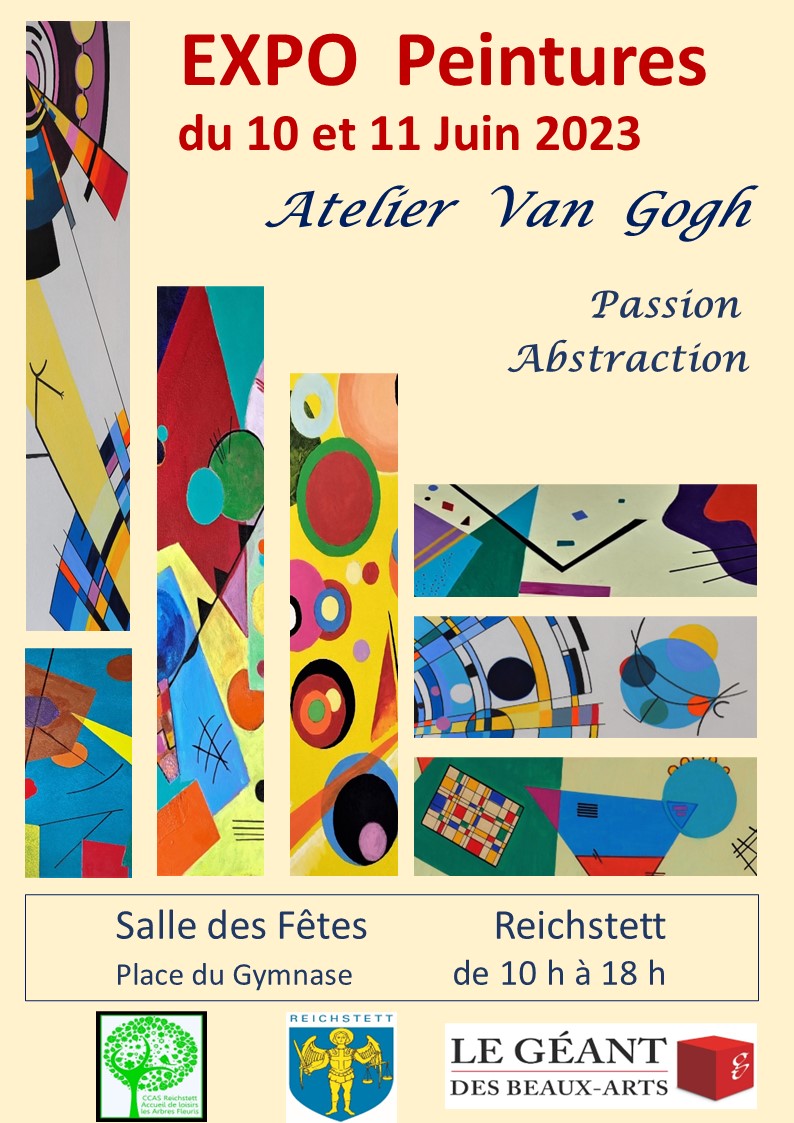 Autour du thème Passion Abstraction, l'Atelier a réalisé des tableaux façon Kandinsky. Maître de l'abstractionà son époque, il travaille les formes géométriques, les couleurs vives, soit une multitude de combinaisons pour ce thème revisité par nos artistes membres.