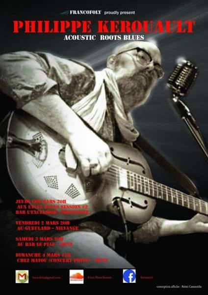 Philippe Kerouault vous invite à découvrir son Blues où Robert Johnson côtoie Jimi Hendrix , Leadbelly et John Lee Hooker entre autre , accompagné de ses guitares acoustiques et slide