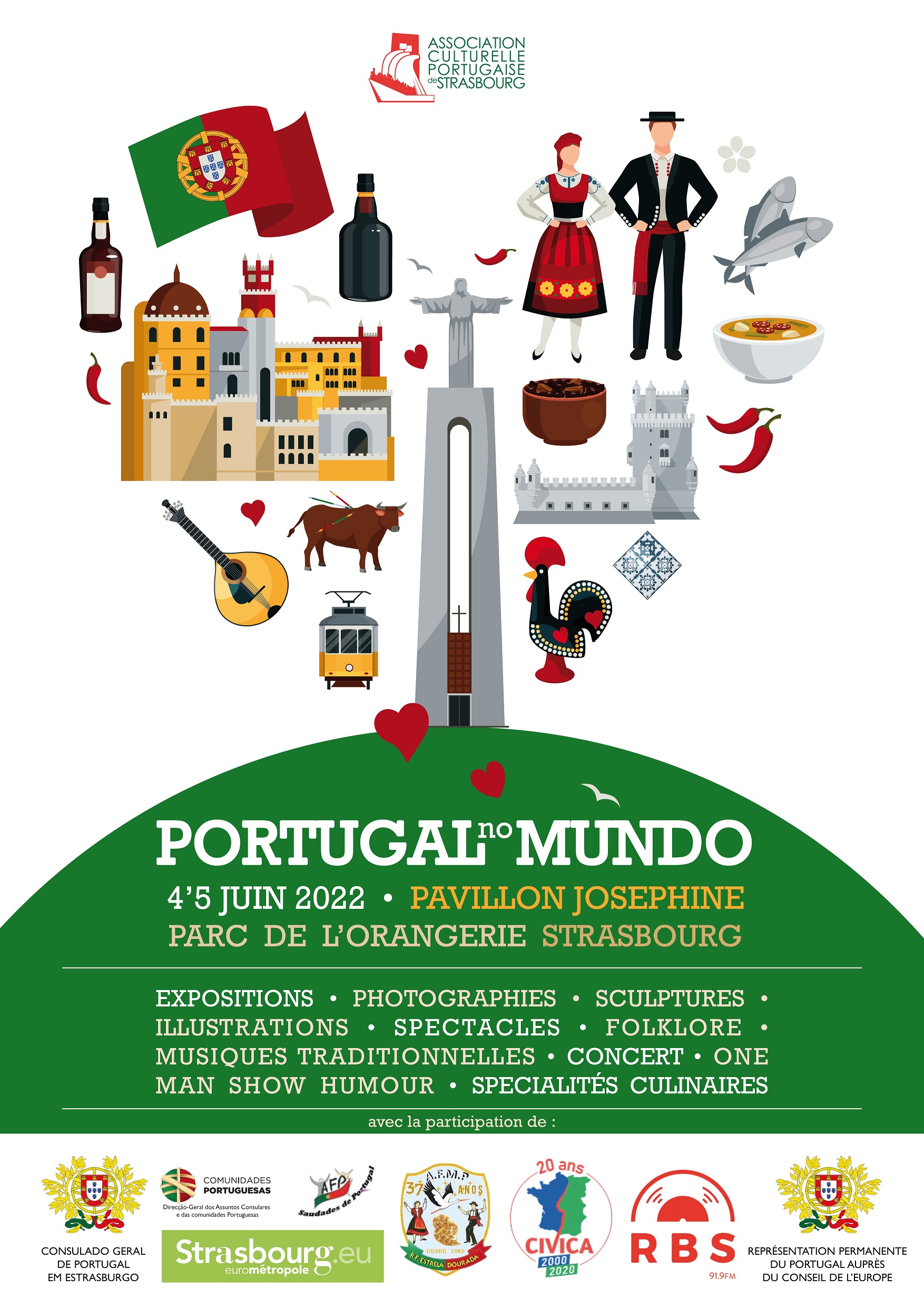 L'Association Culturelle Portugaise de Strasbourg fête ses 35 ans cette année et pour fêter cette troisième décennie d’existence, l'association a décidé de créer un événement autour de la culture portugaise. Le mois de JUIN où le Portugal commémore “le jour du Portugal, de Camões et des Communautés portugaises”, a inspiré ce projet Protugal no Mundo.